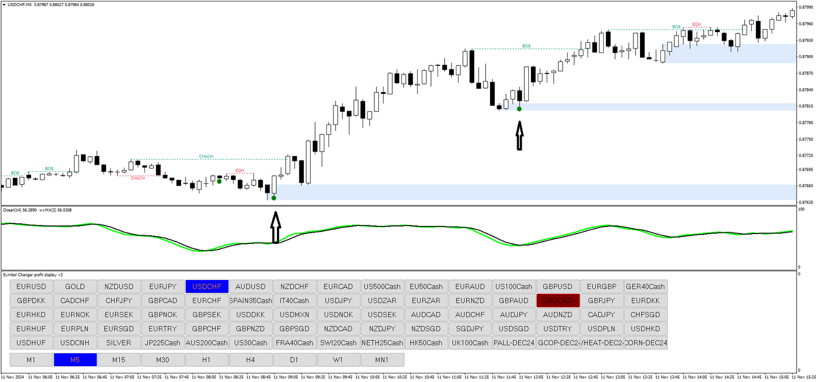 - Confirmação do Ocean RSI: O Ocean RSI deve cruzar acima de sua SMA de 3 períodos, indicando momentum ascendente.
