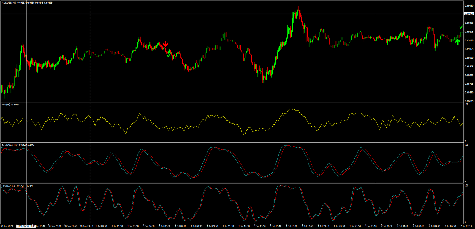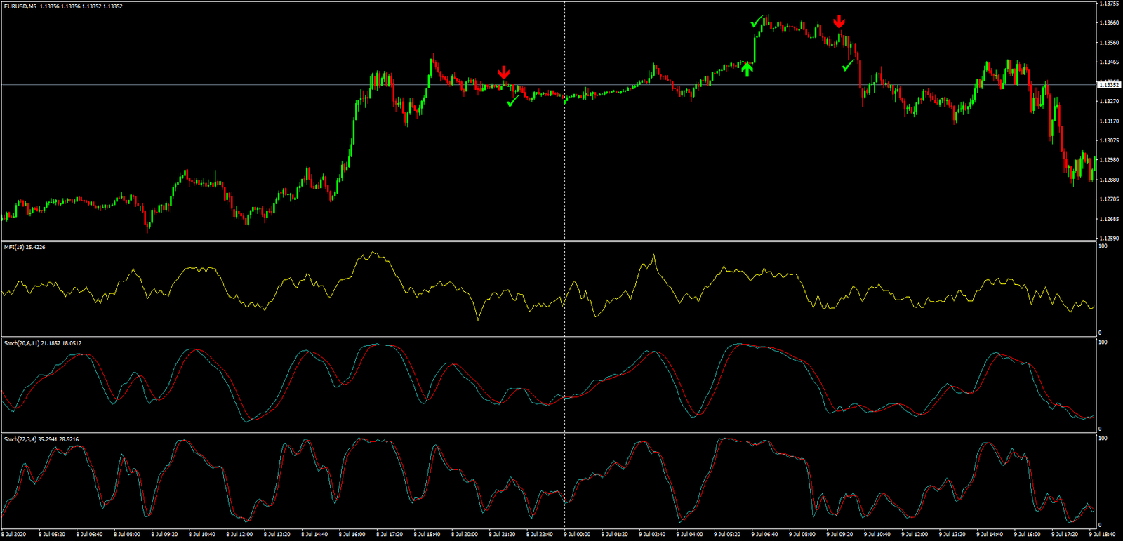 - Condição: Quando o MFI indica que o mercado está sobrecomprado e começa a cair, enquanto o Estocástico cruza para cima, é o momento ideal para abrir uma posição de compra.