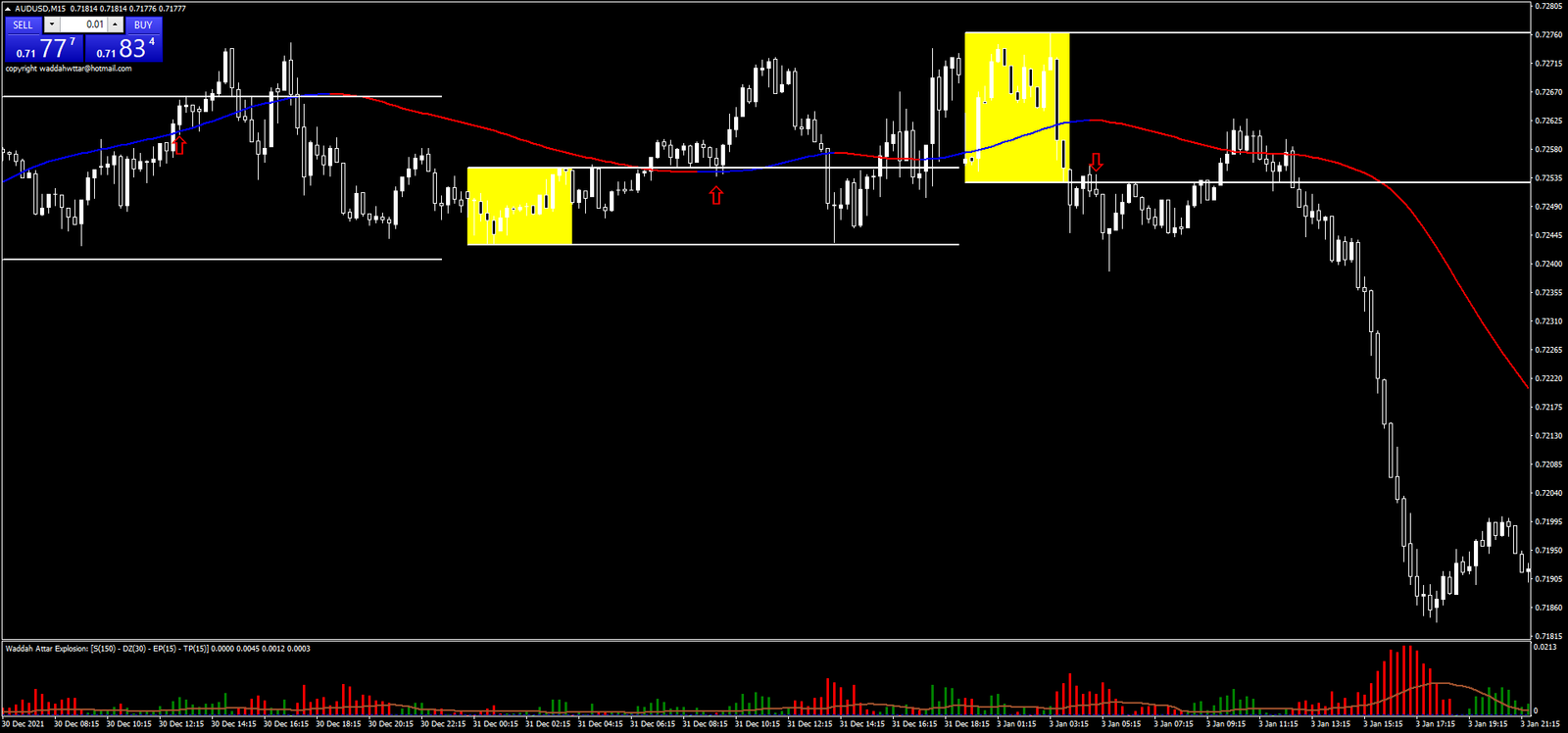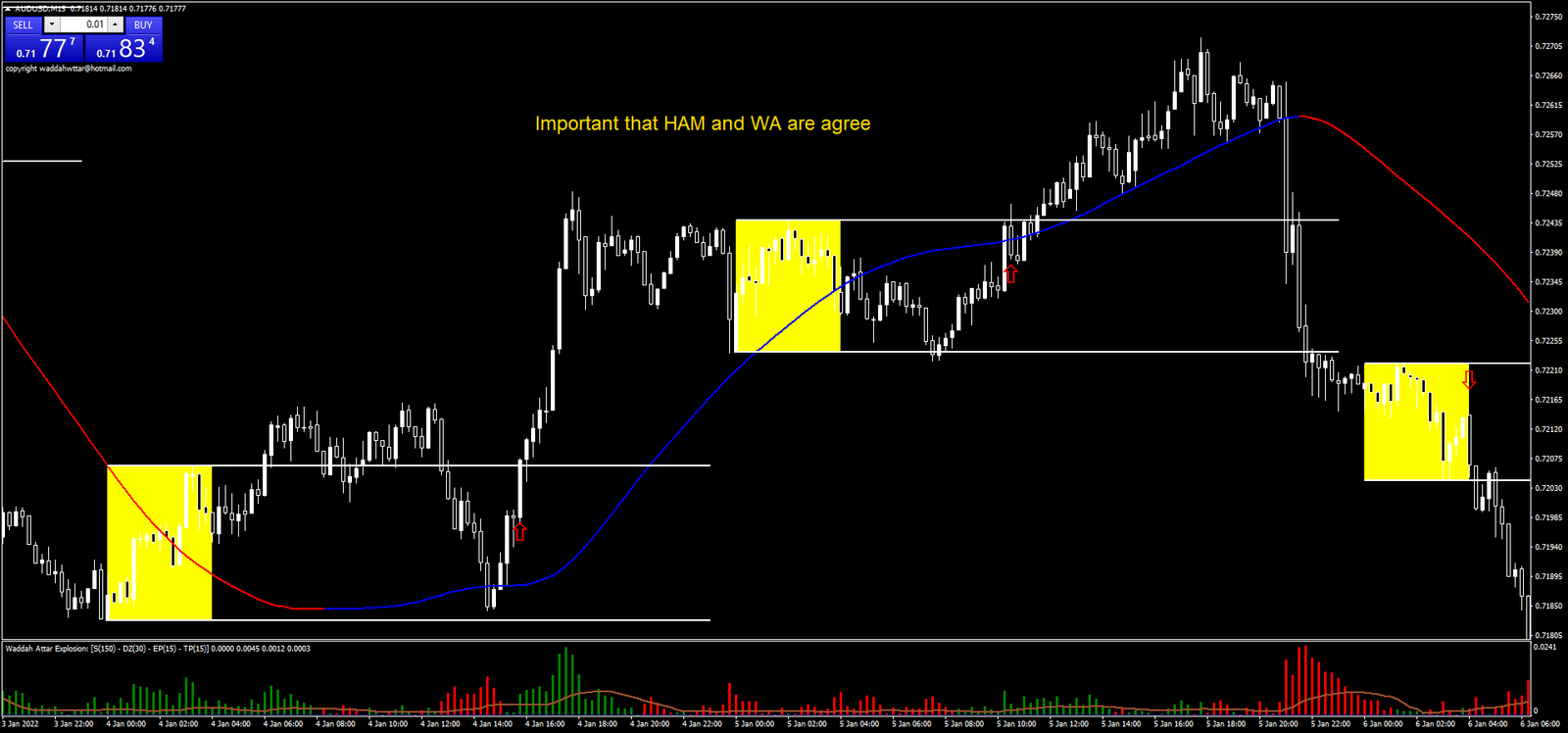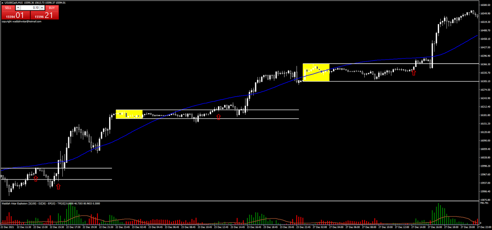 - Confirmação do Waddah Attar: Além disso, o indicador Waddah Attar deve mostrar barras verdes (alta) ou vermelhas (baixa) acima da média móvel, indicando que o mercado está forte na direção do rompimento.