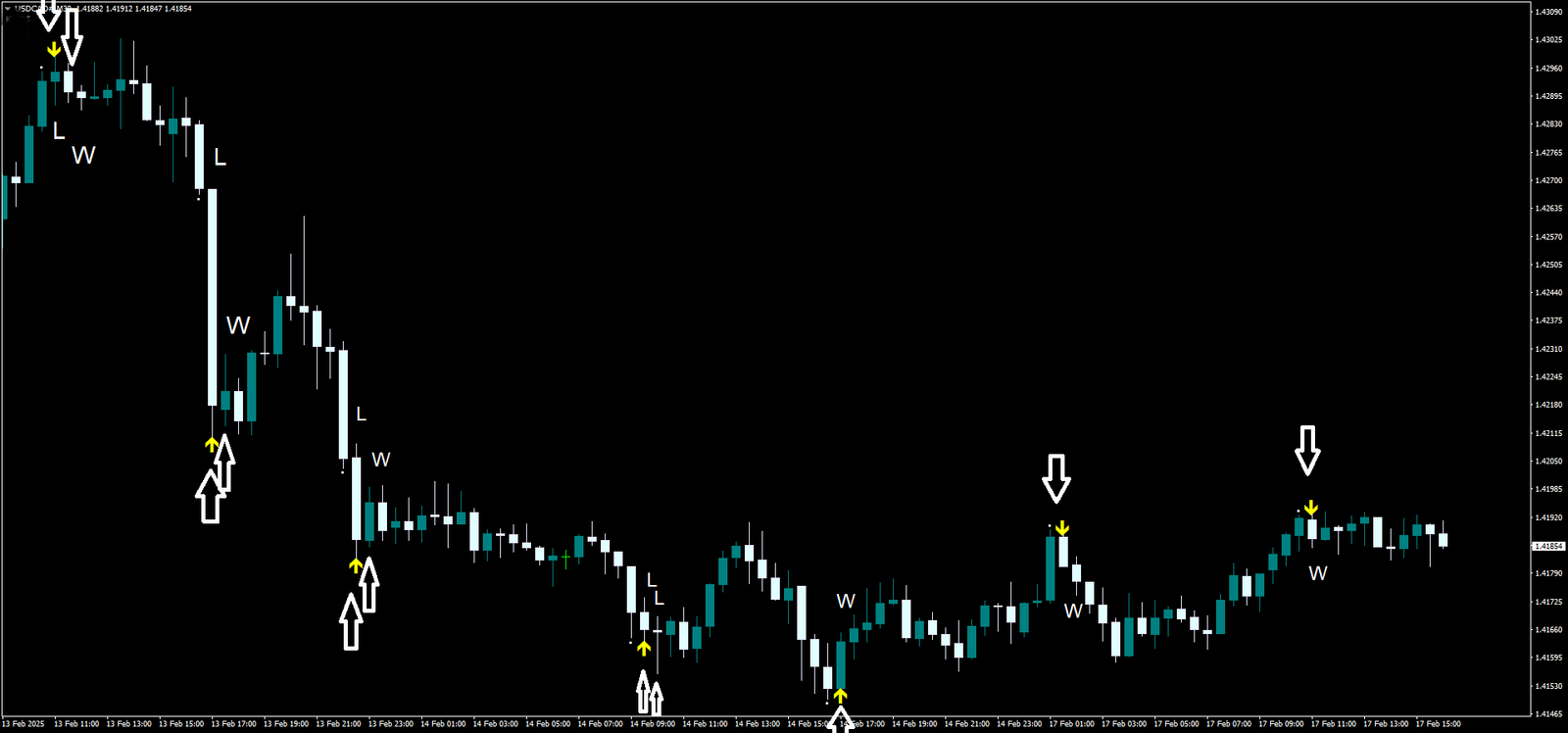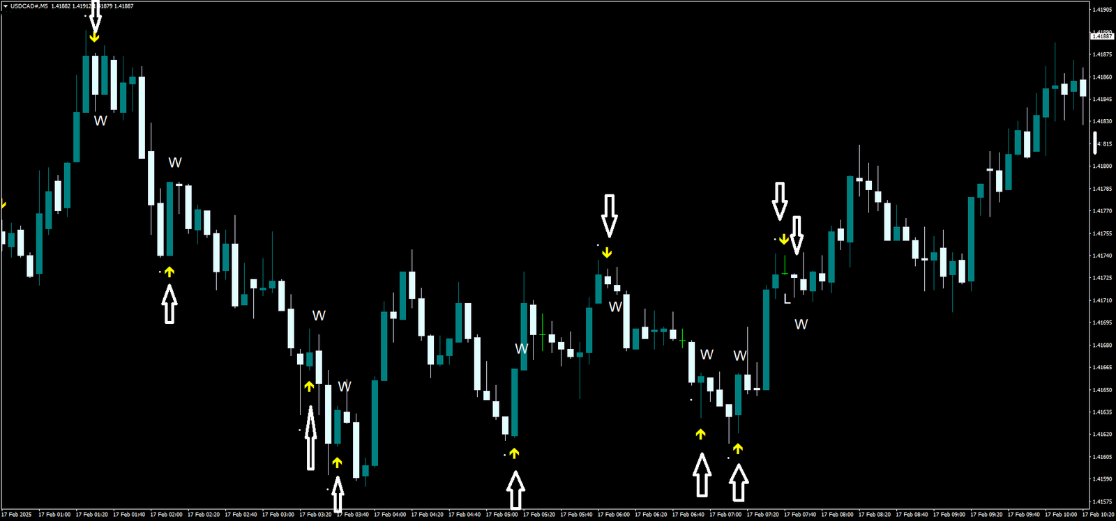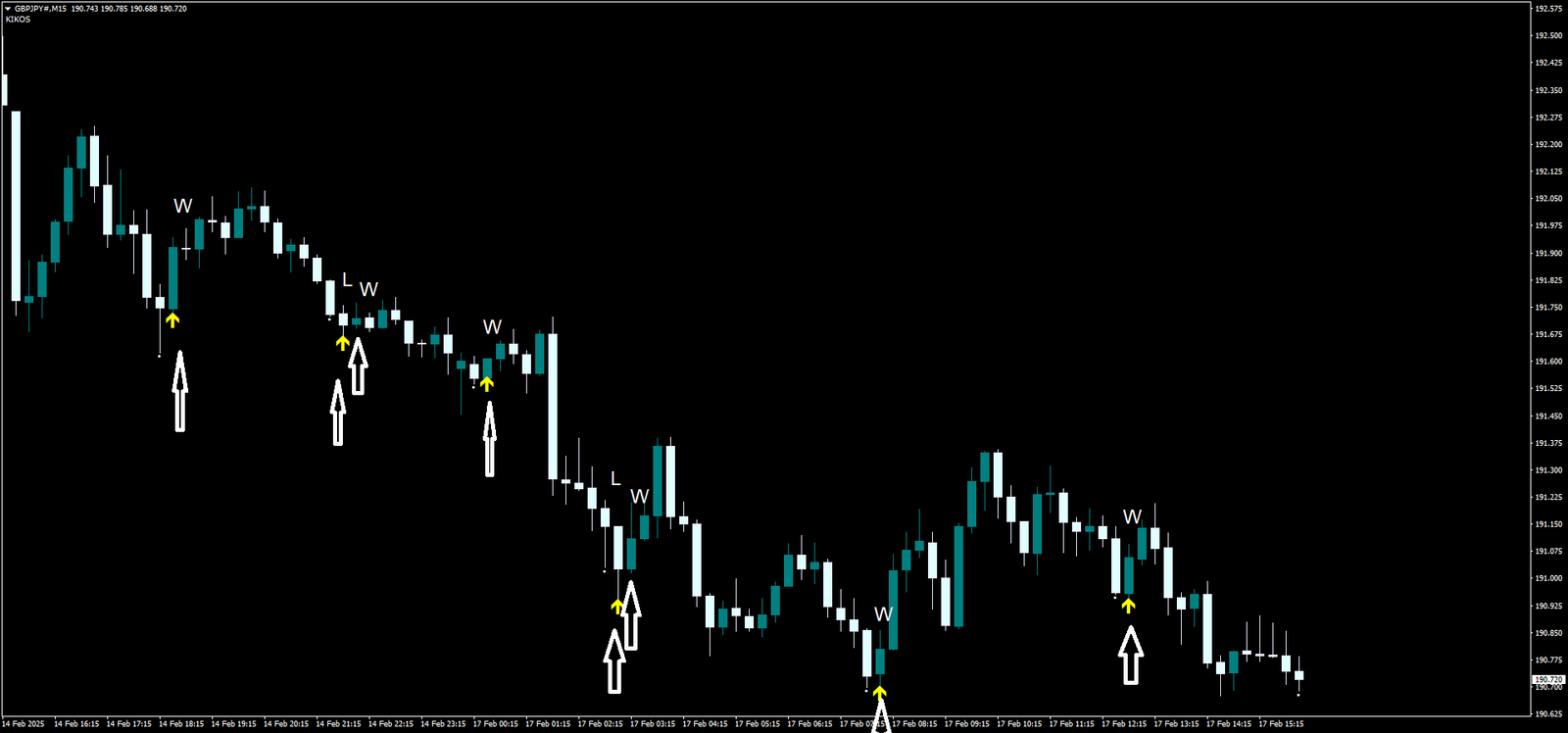 - Um ponto branco aparece, seguido por uma seta para cima (sinal de compra).