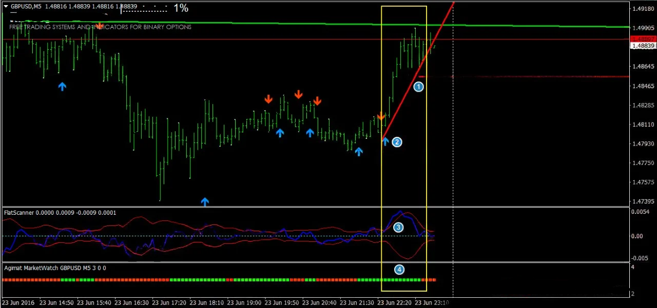 A estratégia se baseia na interpretação correta da ideia de mercado, combinando métodos para mercados em tendência e em consolidação. Durante um forte movimento de mercado, a inércia é alta, o que pode fazer com que os sinais apareçam cedo demais. Para mercados em tendência, é recomendável escolher um período de expiração mais longo.