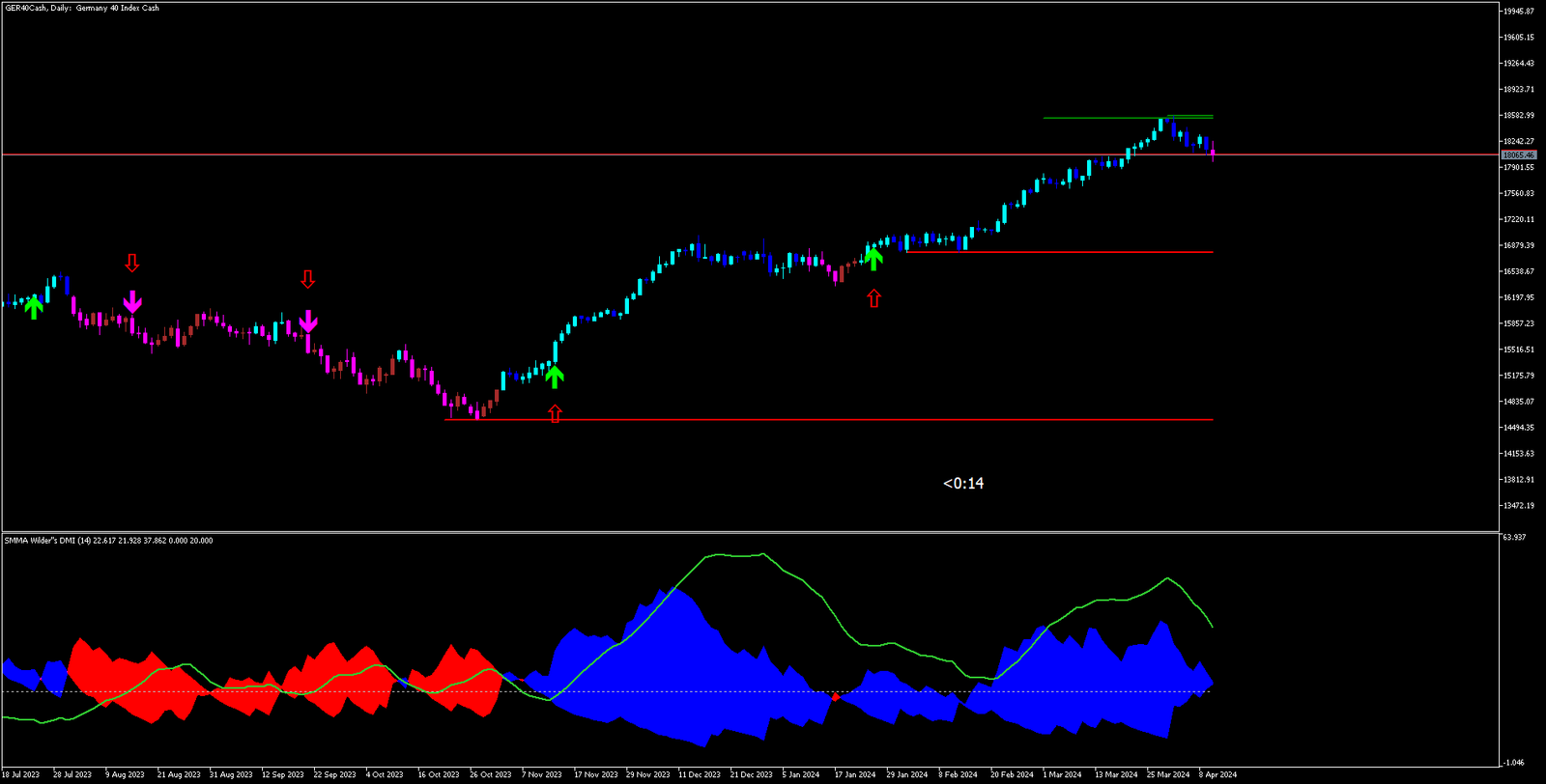 ADXMede a força da tendência e confirma entradasLinha verde, 14 períodos, nível 20
