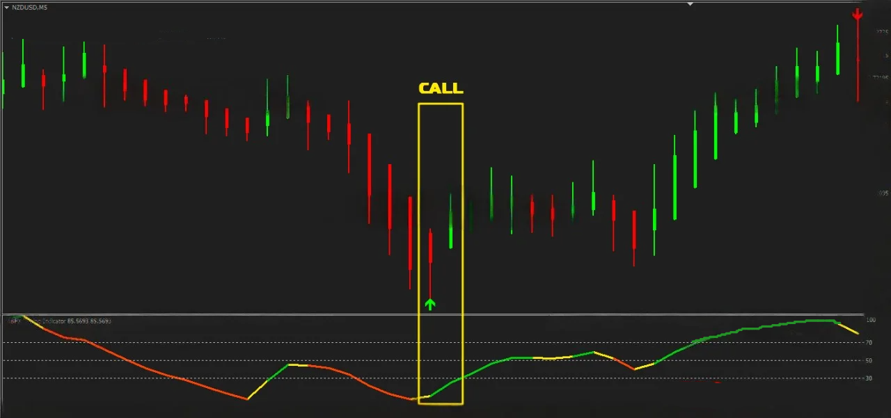 • Verde: Indica tendência de alta, sugerindo possíveis pontos de entrada para compra (CALL).