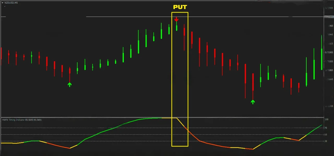 O MBFX Timing é um oscilador tricolor que mostra a direção atual do mercado. Com um código de cores (verde para alta, vermelho para baixa e amarelo para transição), ele ajuda a identificar pontos de reversão e mudanças de tendência.