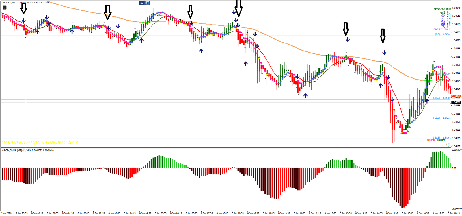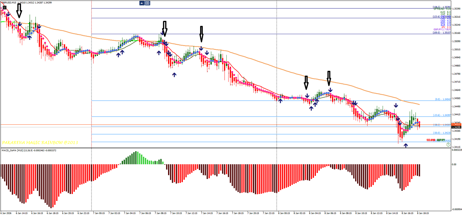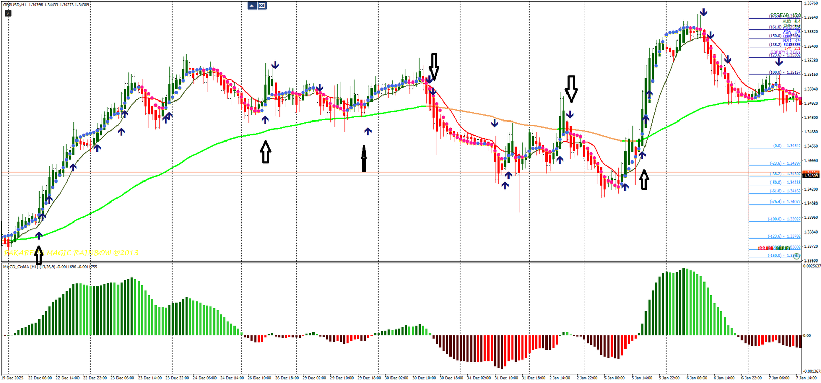 Versão mínima: Magic Arrow + Non Lag Dot + MACD Osama + Heiken Ashi. Porém, domine a estratégia completa por 6 meses primeiro. Simplifique por conhecimento, não por preguiça.