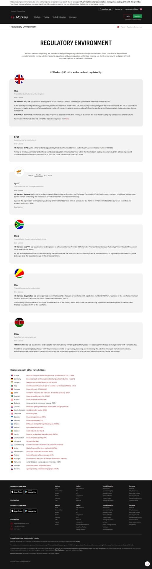 A HFM opera sob supervisão de múltiplas autoridades reguladoras respeitadas globalmente, incluindo a Financial Conduct Authority (FCA) no Reino Unido, a Cyprus Securities and Exchange Commission (CySEC) na Europa, a Dubai Financial Services Authority (DFSA) nos Emirados Árabes Unidos, a Financial Sector Conduct Authority (FSCA) na África do Sul e a Financial Services Authority (FSA) em Seychelles, proporcionando camadas redundantes de supervisão regulatória.