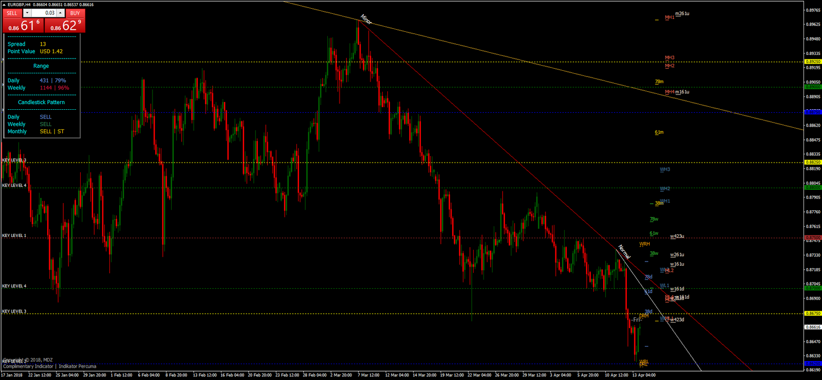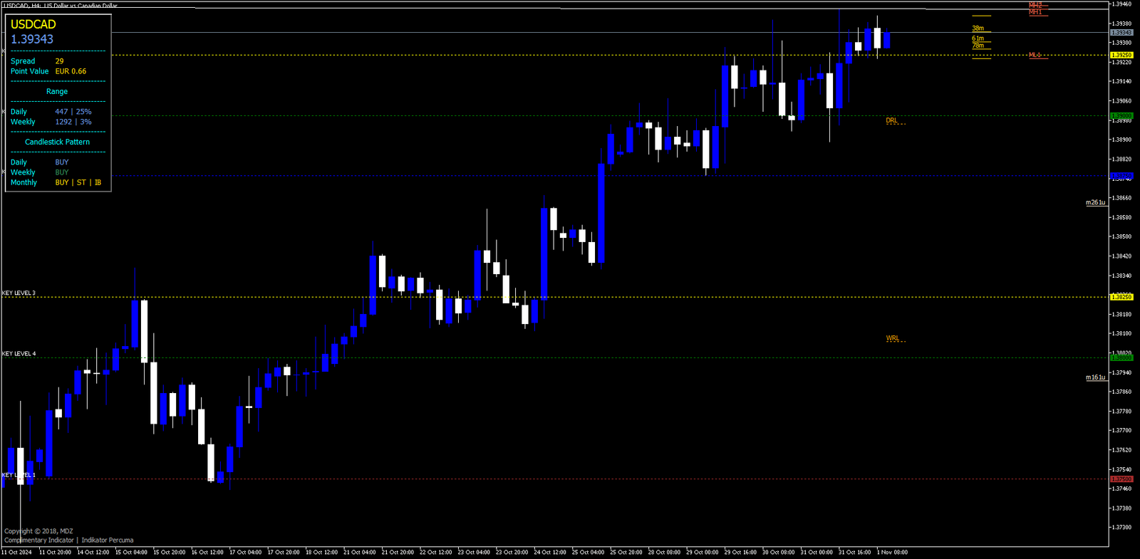 O Indicador de Ação de Preço MDZ apresenta vários elementos críticos que ajudam os traders a avaliar o mercado com precisão: