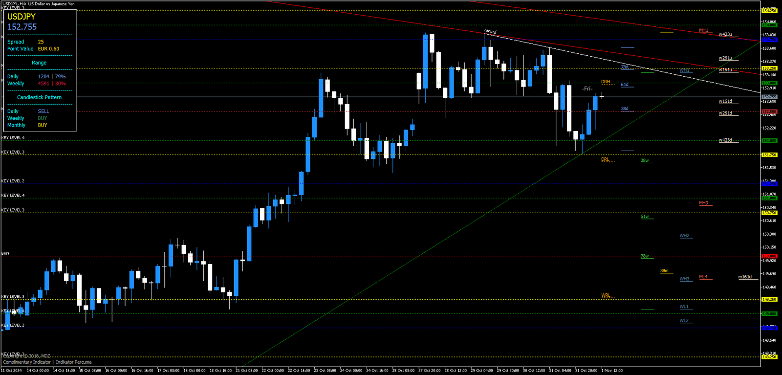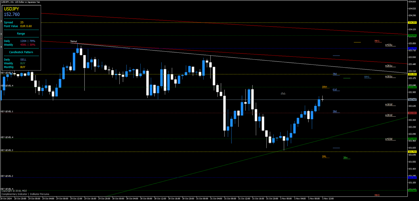 - Identificação: O gráfico diário mostra uma tendência de alta confirmada pelas linhas de tendência do Indicador MDZ.