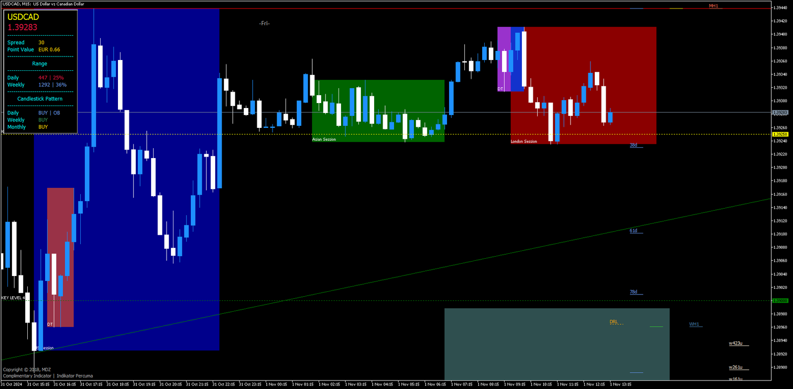 Diferentes sessões de negociação (Asiática, Europeia e Americana) têm características únicas, como níveis de volume e volatilidade. O Indicador MDZ destaca essas sessões, fornecendo aos traders insights sobre quando o mercado provavelmente experimentará maior atividade e liquidez.