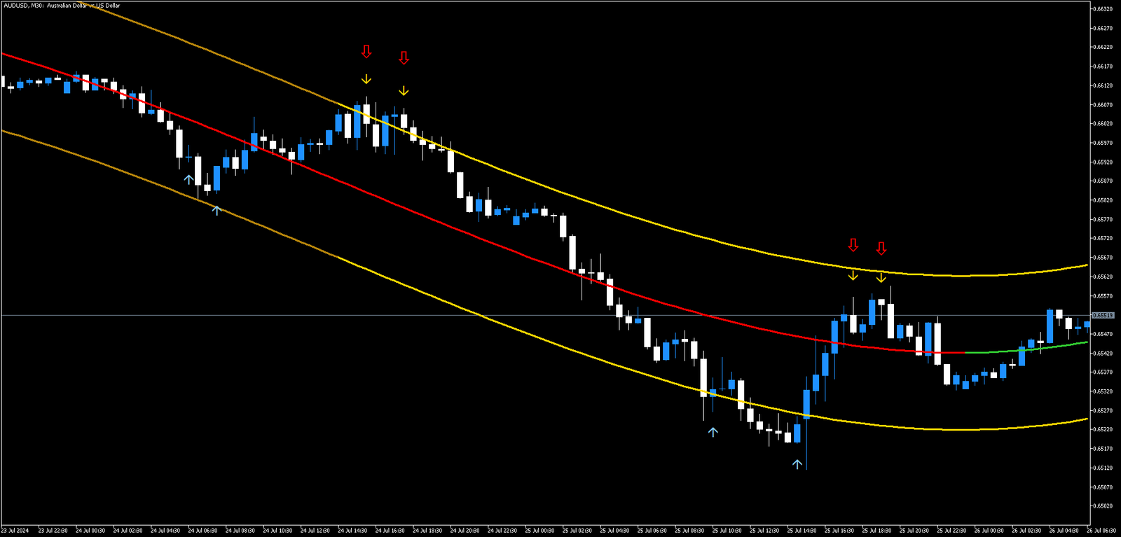 Nota Importante: As setas devem ser consideradas quando o preço estiver próximo das bordas das bandas. Evite entradas quando o preço exceder a banda central.