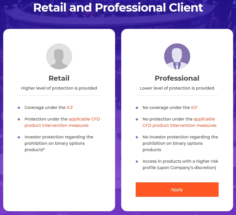 A conta profissional tem um nível inferior de proteção e qualificação requer uma quantidade significativa de volume de negociação, carteira considerável e experiência financeira anterior.