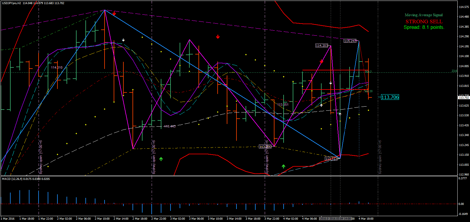 - ROMAR: Este indicador define a tendência principal do mercado em relação à EMA. Acima da EMA, indica uma tendência de baixa; abaixo da EMA, uma tendência de alta. A sincronia entre os três gráficos (1 hora, 2 horas e Diário) com o ROMAR é fundamental para confirmar a direção do mercado.